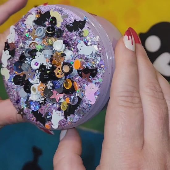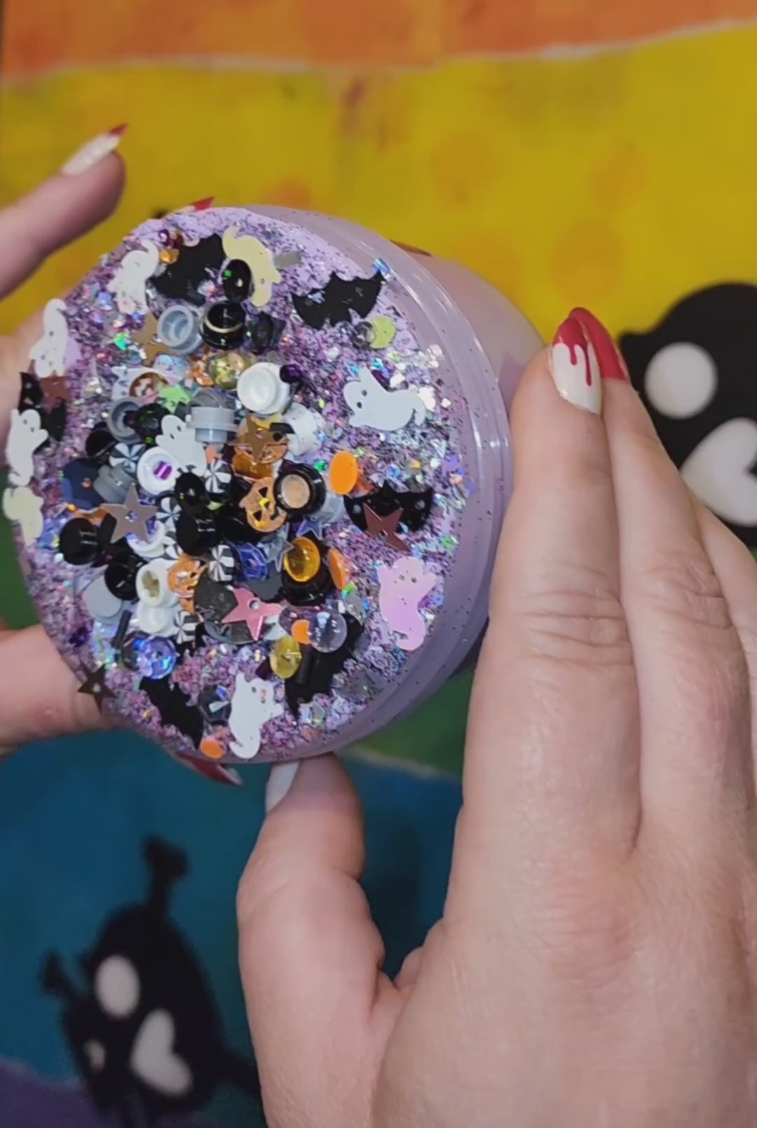 Topped with a chaotic mix of sparkly glitters, holographic cellophane, Halloween fimos, sequins, and those iconic little circular LEGO bits, this slime is a sensory riot (pun fully intended). Perfect for anyone who owns their spooky side with unapologetic flair.