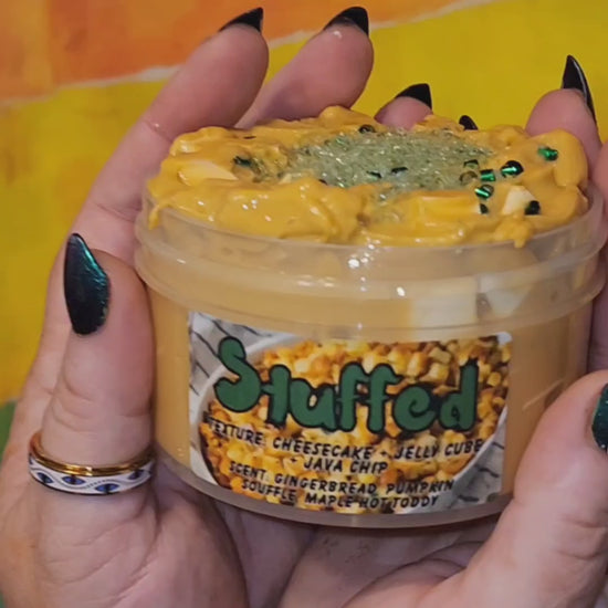 “Stuffed” is the post-Thanksgiving food-coma feeling in slime form. Inspired by that glorious moment when you’ve eaten way too much stuffing, and you regret nothing. This slime features our original cheesecake texture. It’s thick, plush, creamy, and endlessly playable. We packed it with Korean jelly cubes and java chips for an addictive squish + crunch combo. It’s basically a texture buffet.
