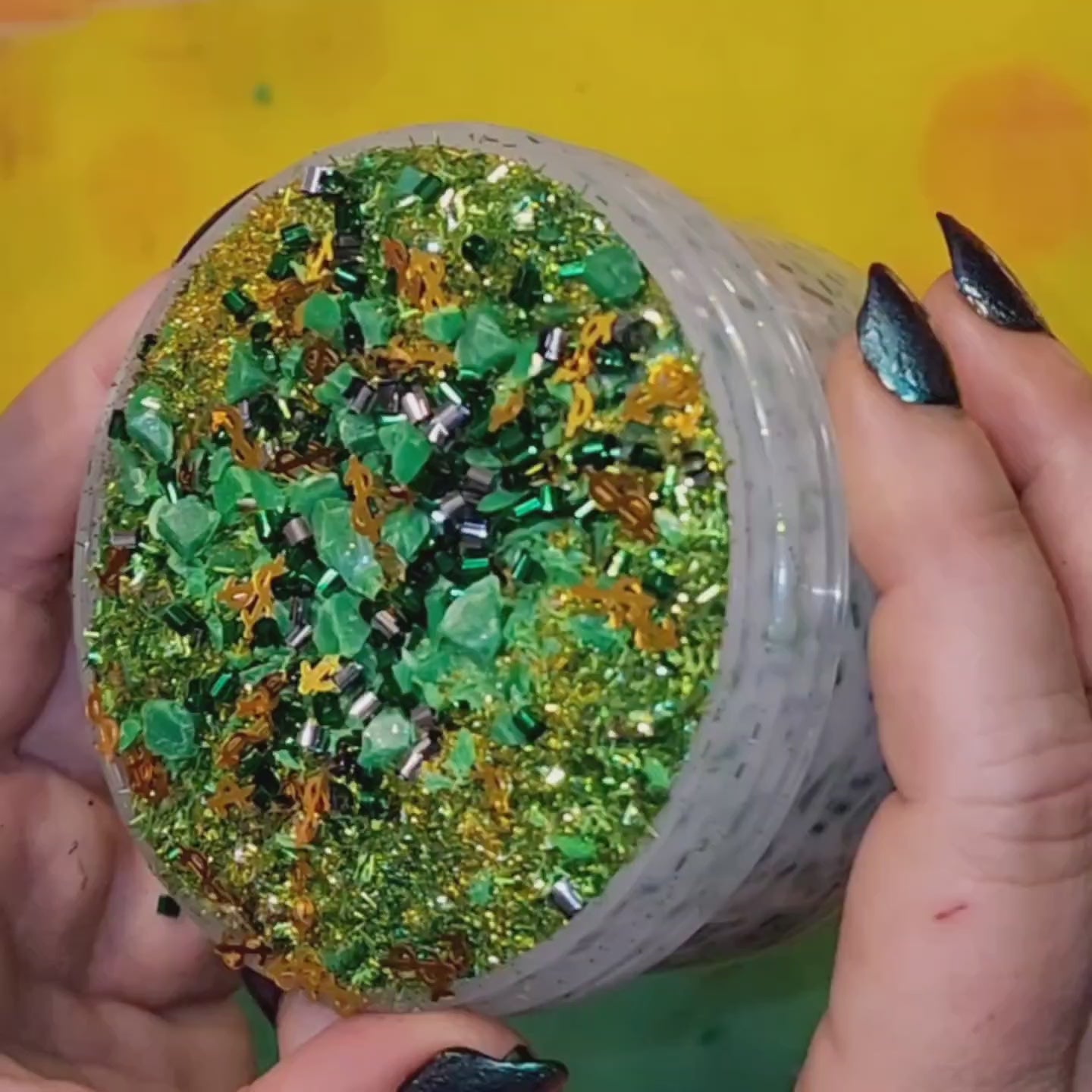 Texture: Thick jiggly white glue base moderately packed with green silica crunchies and green and silver bingsu NOT FOR SENSITIVE HANDS